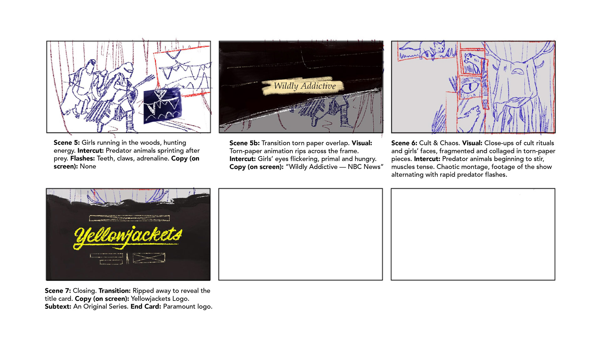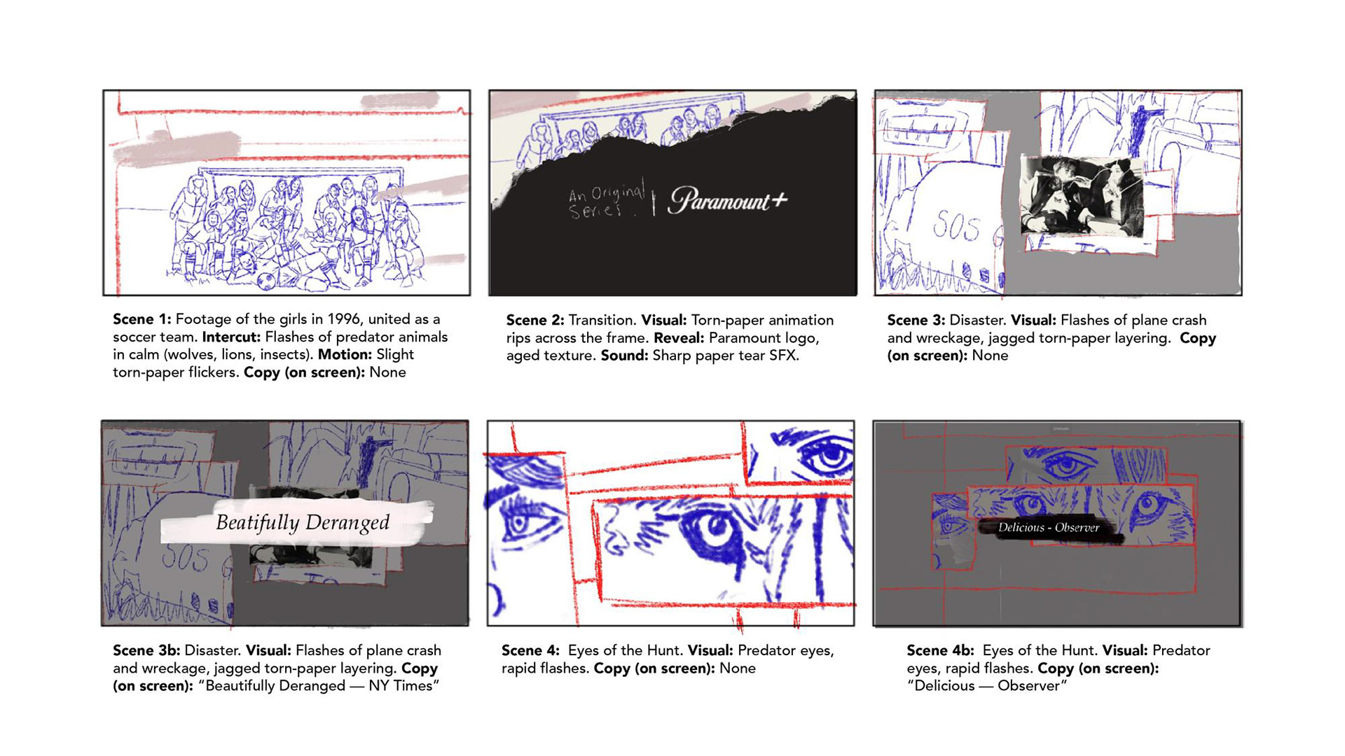Two visual directions were explored for the show. The first embraced a dark, grungy tone built from torn paper edges, cryptic typography, and sharp flash cuts, drawing a haunting parallel between wild predators and the team’s gradual descent into a feral pack.